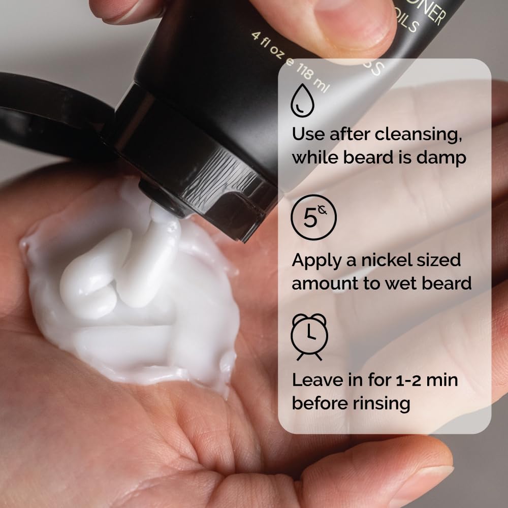 - BEARD WASH TIP: Thoroughly wet your beard, apply a nickel-sized amount of conditioner into your palm, rub in your hands together, and lather the conditioner into your facial hairs. Leave in to absorb for a few minutes and rinse thoroughly.