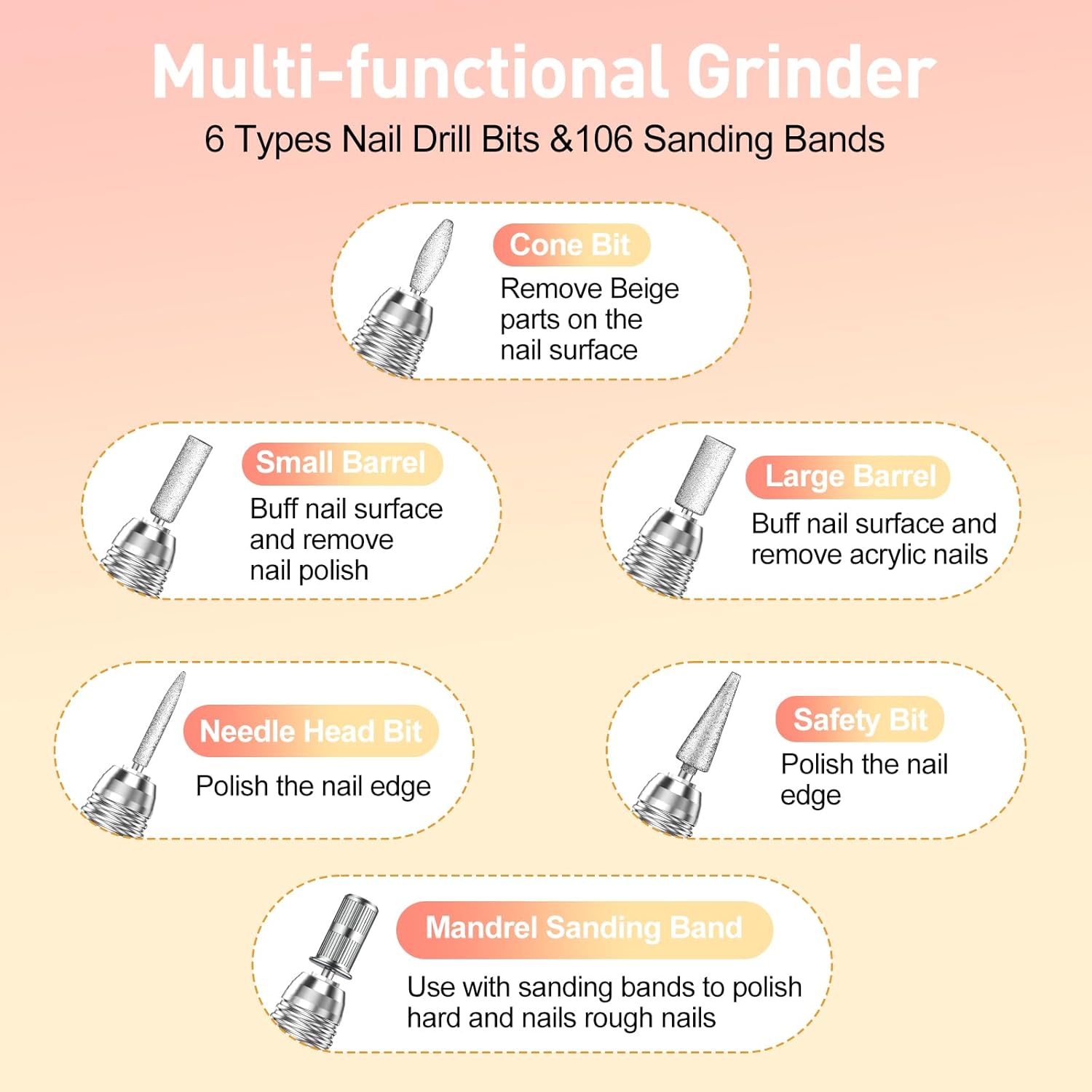 - Professional Nail Drill Kit: Electric nail file equipped with 6 nail drill bits and 100pcs sanding bands, meet all your demands for acrylic gel nails, dip powder nails and poly nail gels, works effective for polishing, shaping and removing