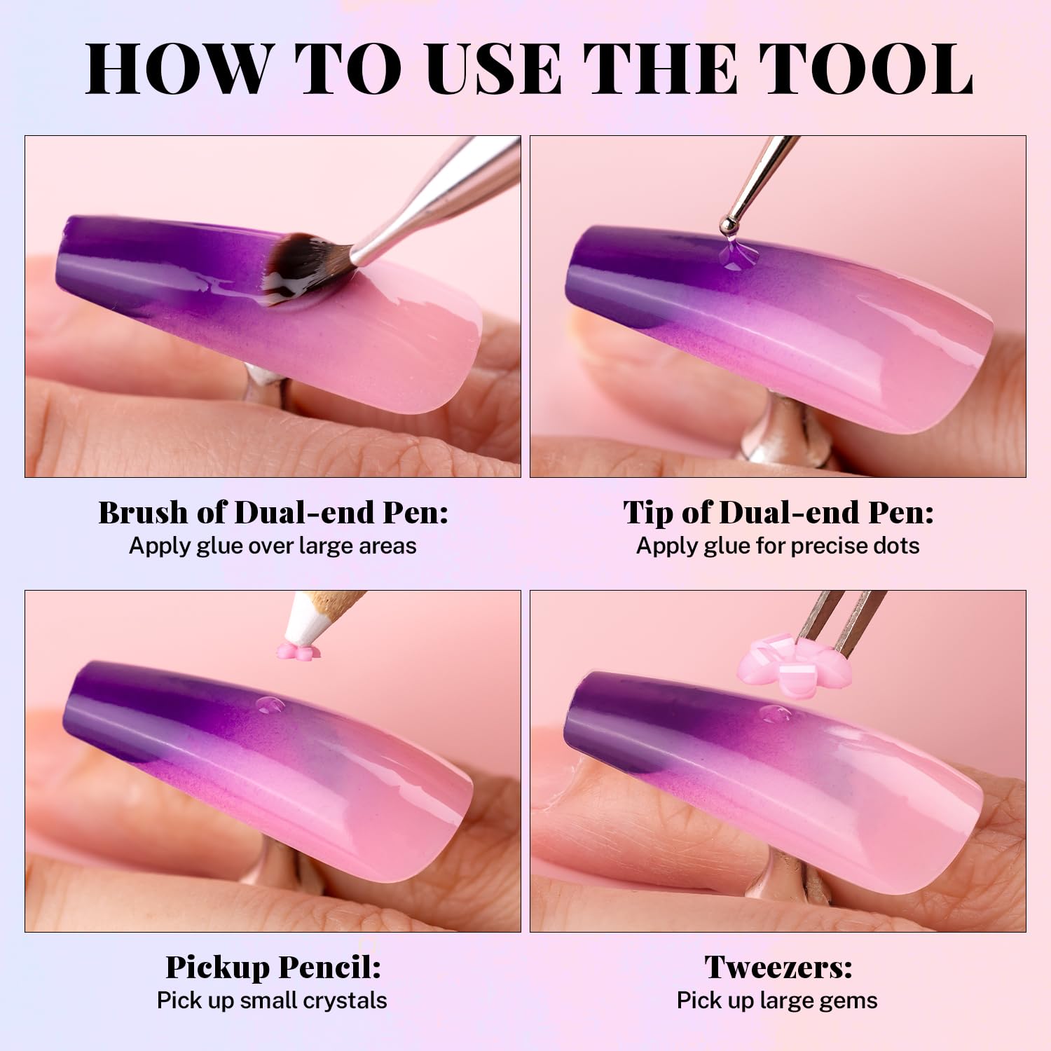 - 💎RHINESTONE DOTTING PICKER TOOLS: The wide-head brush end of the dual-end dotting tool makes it easy to apply a large amount of glue to the nail surface at once, while the other mini dotting end is great for detailed drawing, so you can pick up a blob of glue and draw the pattern you want on your nails. Picker pencil can help you handily pick up small flowers and metal beads, while tweezer is a better choice for big flowers and beads.