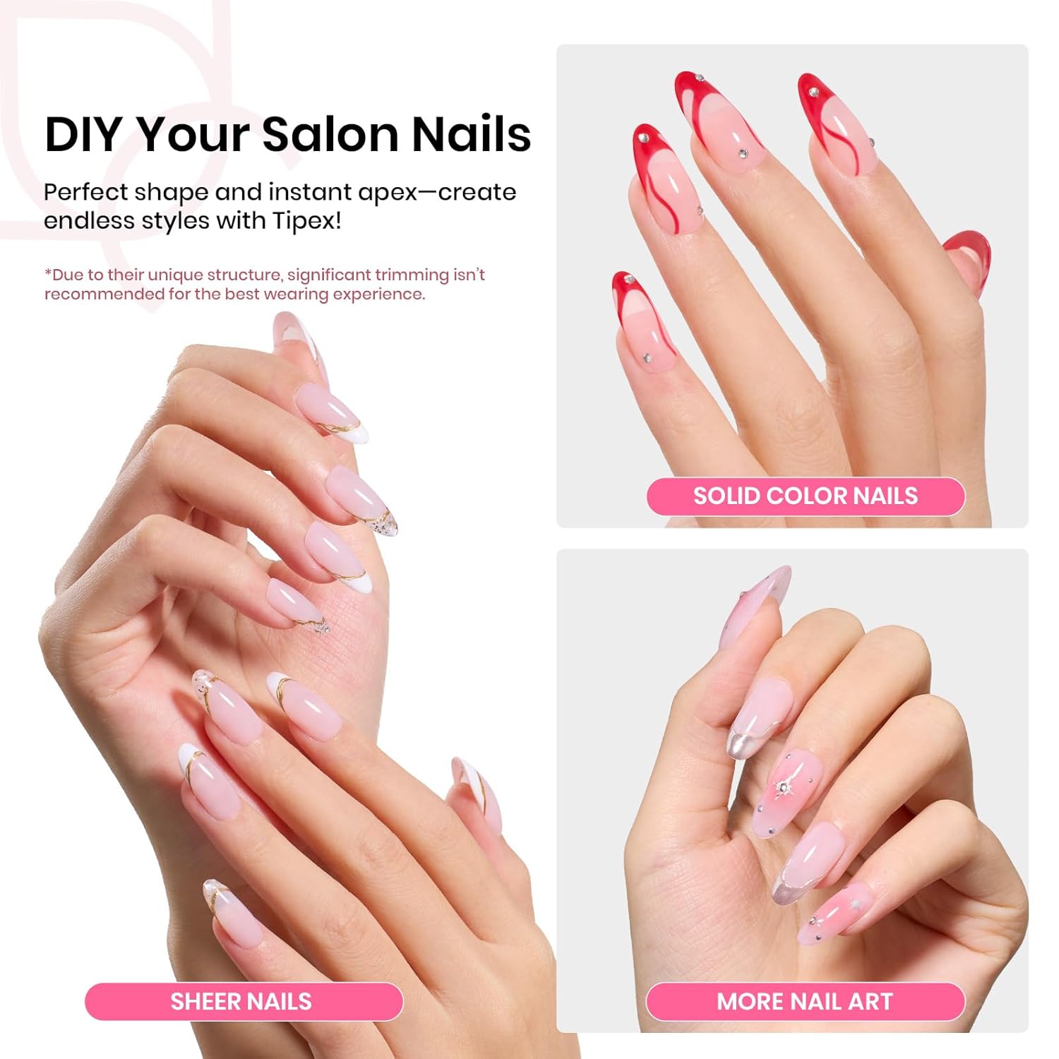 - WARM TIPS: Beetles Tipex tips are designed with a thicker, structured shape to deliver a strong apex and salon-level hold. They’re best suited for NAIL PROFESSIONALS or EXPERIENCED USERS who are familiar with Tipex pre-etched, pre-building tips. For optimal results, we highly recommend using solid nail glue to ensure a secure and even application. Not ideal for beginners or those preferring thin, flexible tips.