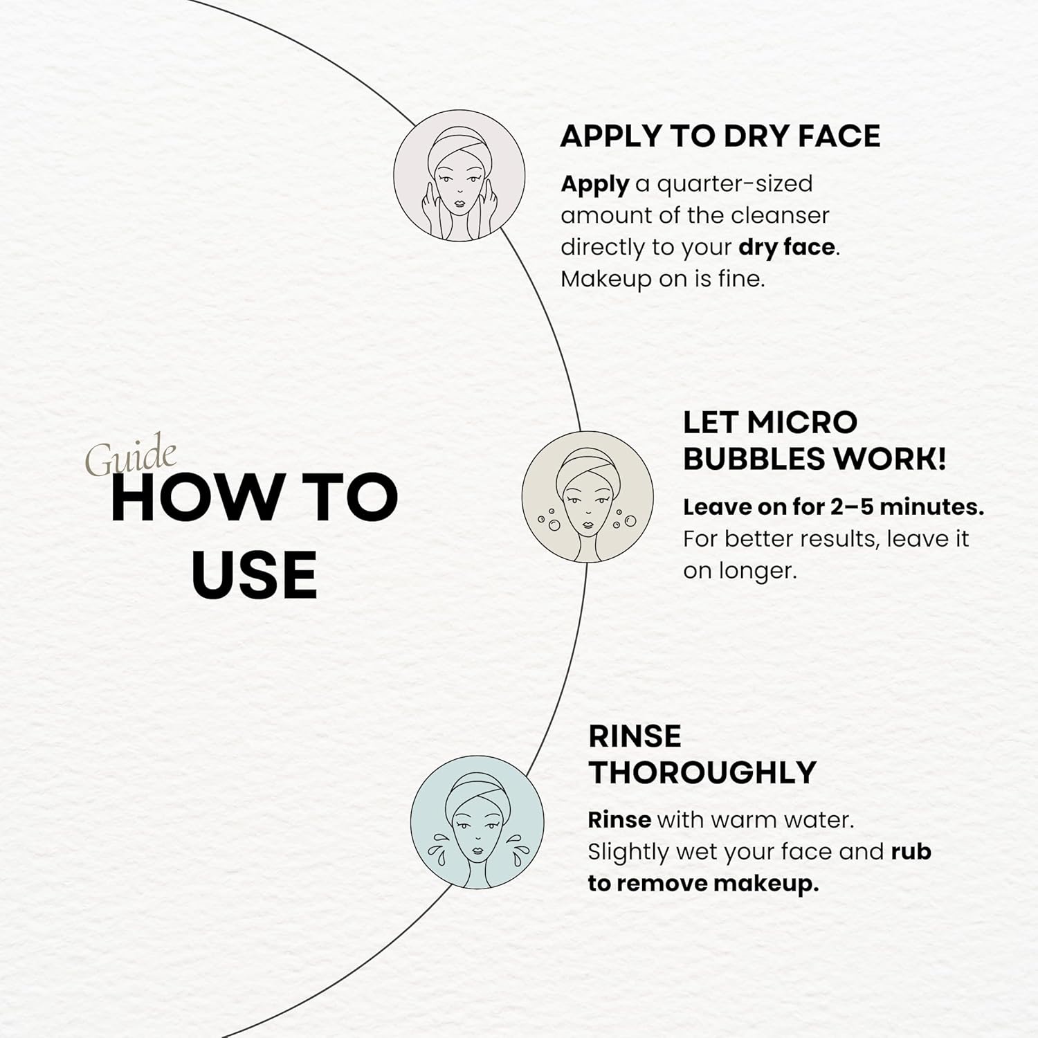 - EASY TO USE – Whether you have makeup on or a bare face, simply apply the cleanser without water, and it will instantly form fine bubbles. The bubble foam penetrates deep into pores to remove impurities, then rinse after 1-5 minutes for a deep pore cleansing experience, leaving skin fresh and purified.