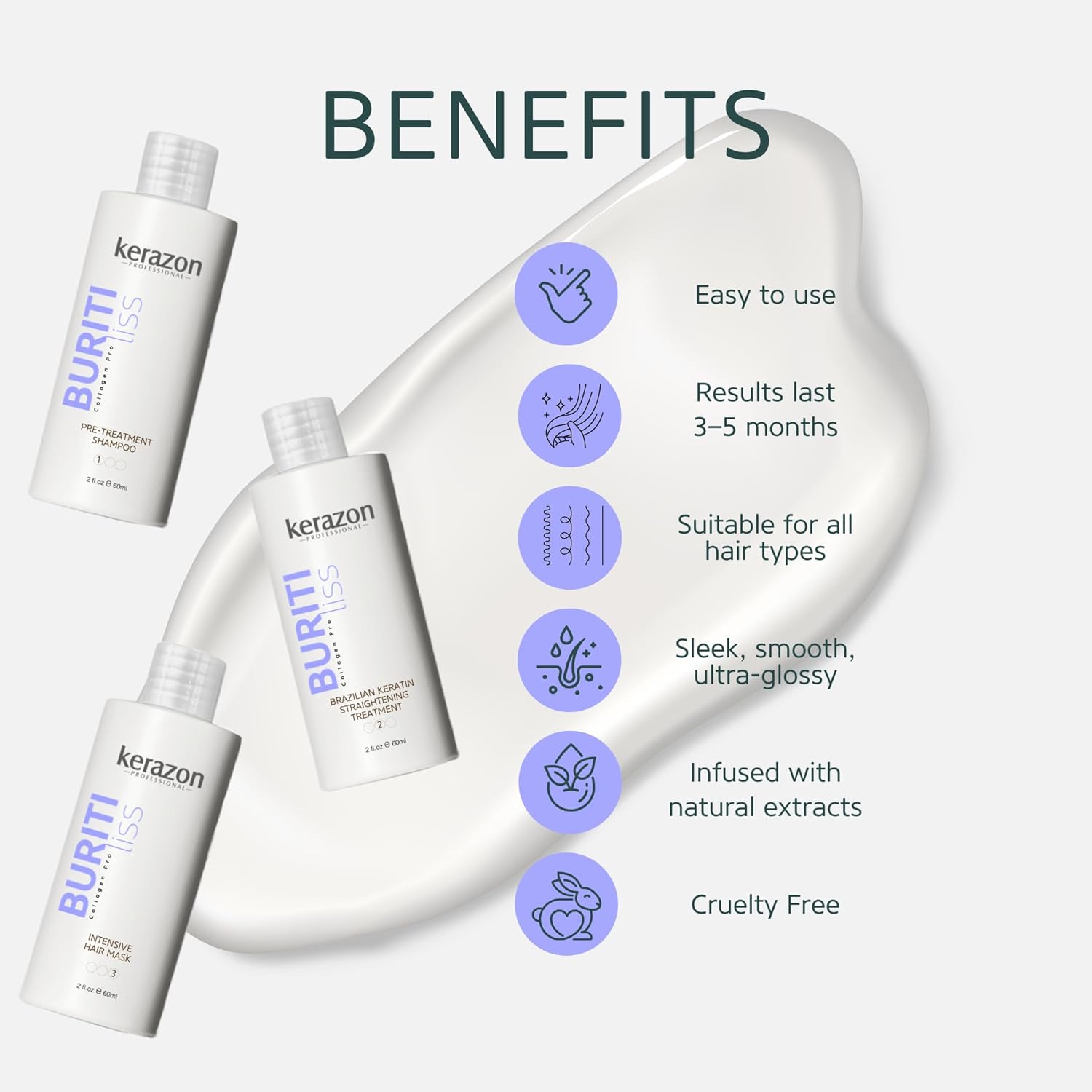 - Straightening & Frizz Control – Smooths and straightens hair for a sleek, humidity-resistant finish. Enriched with a blend of powerful natural ingredients, it effectively straightens and controls frizz, deeply hydrates and restores softness, and strengthens hair for improved elasticity and reduced breakage.