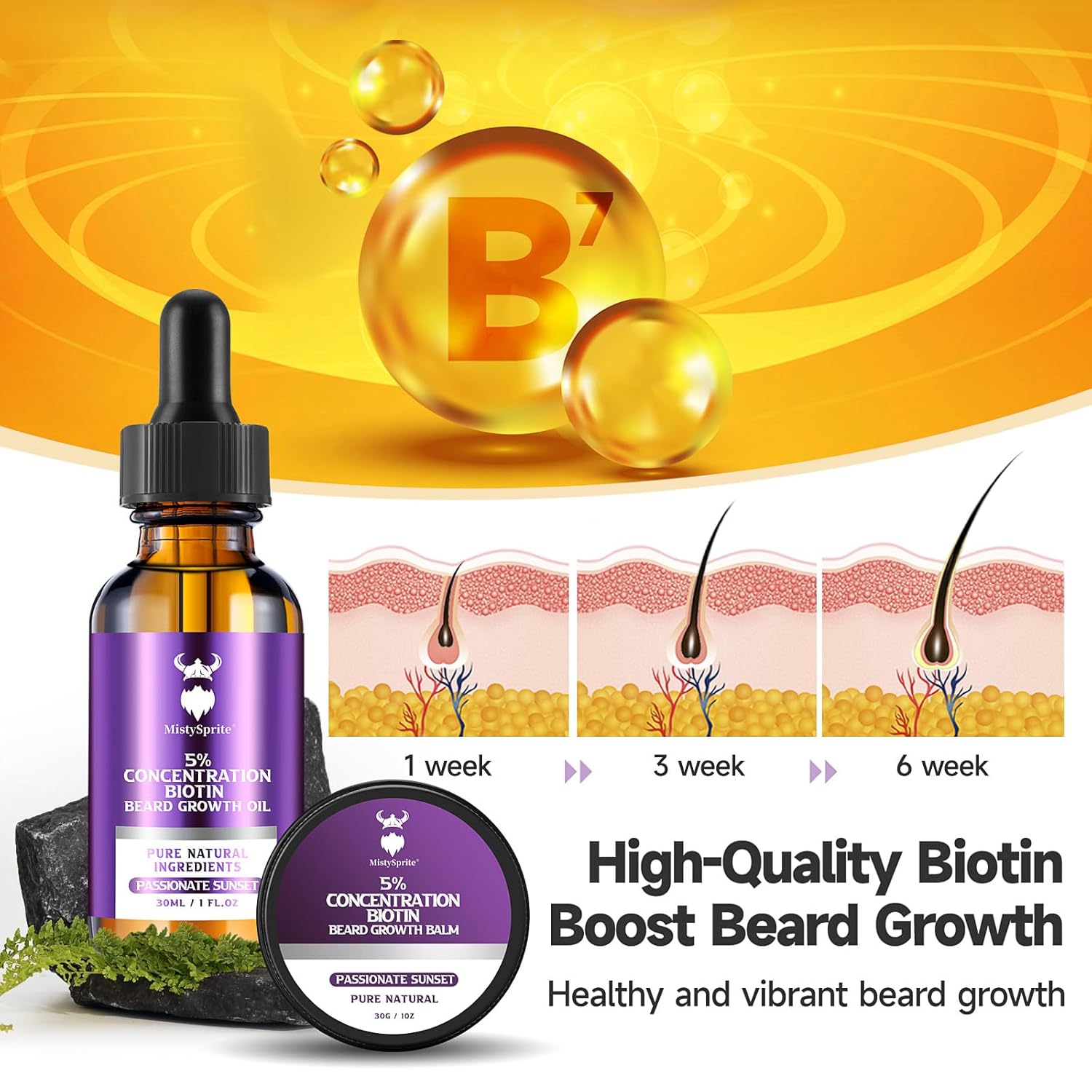 Beard Growth Kit - 5% Concentration Biotin Beard Oil for Men (2 oz) - Natural Mens Beard Oil with Argan Oil, Jojoba Oil and Vitamin, Beard Growth Softener, Moisturizer (Passionate Sunset)