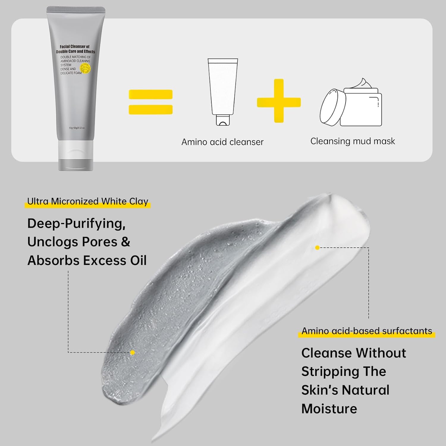 - 【Double Tube Design】The bottle contains two different cleansers. White cream is an amino acid cleanser, while a gray paste is a cleaning mud film. Squeeze from the top, middle, or bottom for different formulas. This face wash gently purifies pores and deeply cleanses while preserving the skin’s natural moisture barrier