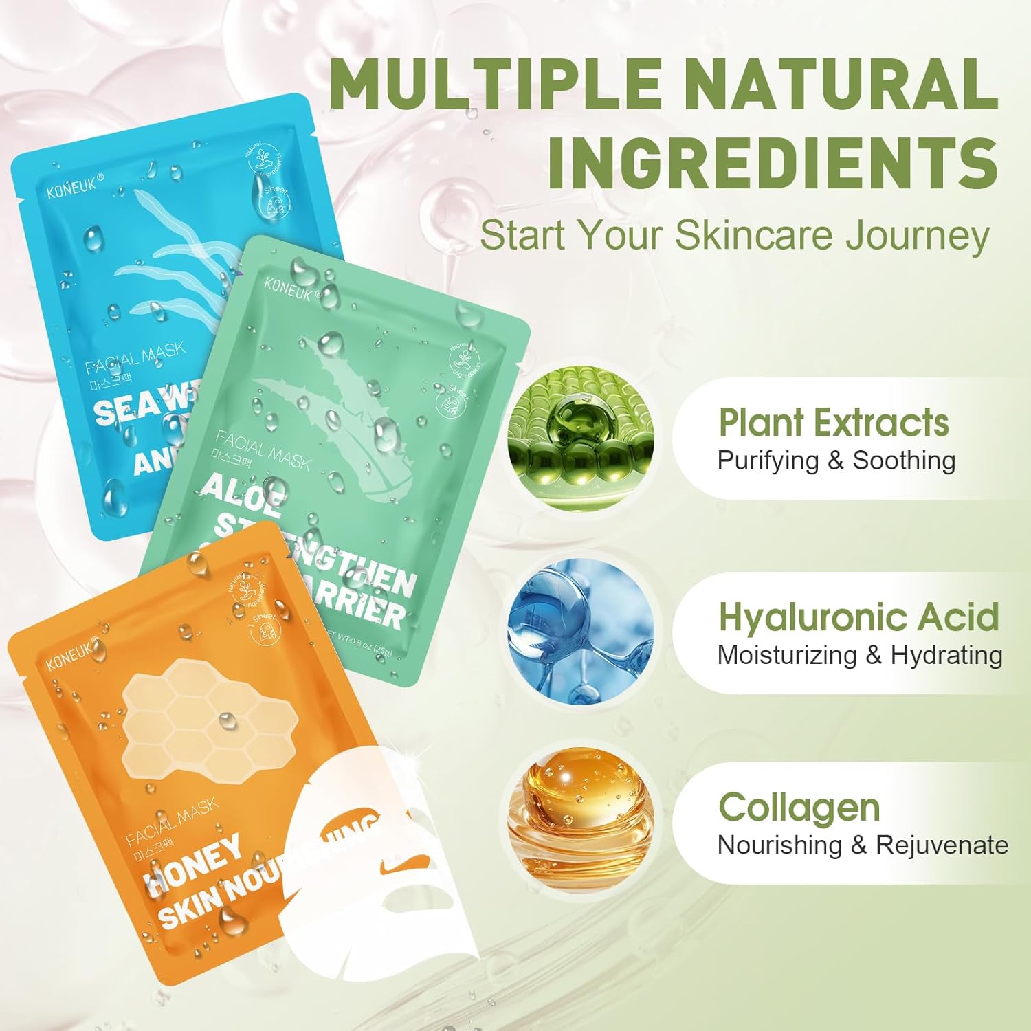 - 【48 Pack Hydrating Face Masks】Our face masks skincare includes a total of 12 types: collagen,seaweed,aloe,avocado,pearl,cucumber,grapefruit,lemon,honey,pomegranate,charcoal,and milk,4 pieces of each type of facial mask.Different facial masks target different skin problems,deeply hydrate,improve dryness,and make skin softer and smoother